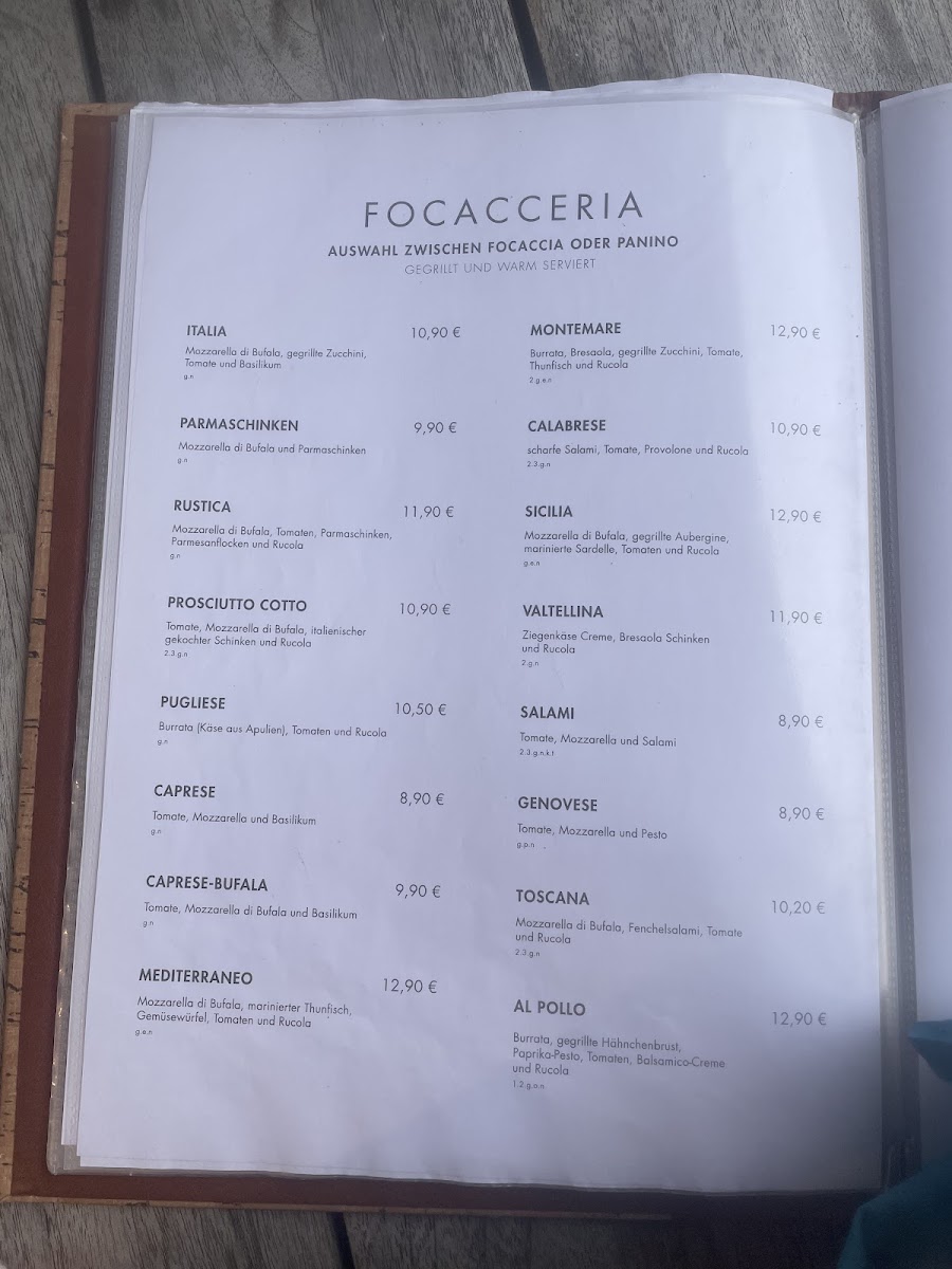 In addition to beverages and desserts, the café serves light food items including focaccia sandwiches, which appear as a choice for a light meal or snack during the day.